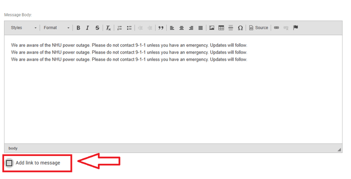 Remember if your message text is too lengthy and it is a PUBLIC alert, you can click Add Link to Message under the Message Body to include a URL for the text recipient to click on to see all of the data, including pictures.