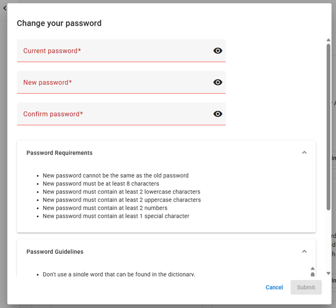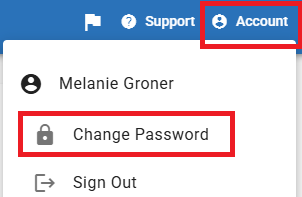 From the top right navigation, click on Account, then Change Password. Follow the Requirements and Guidelines to change your Password.