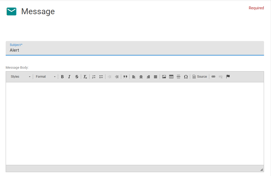 The subject and message fields are both required to be able to send an alert. Fill out the subject even if it is pre-populated to be based on the type of alert you are sending. Use the Rich Text Editor to type in your message, add links or images.