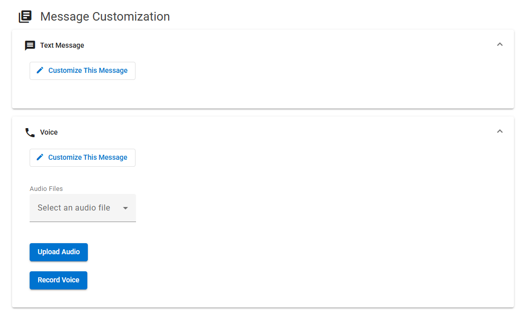 This section allows users to customize the text message and voice message. In-browser voice recording is available.