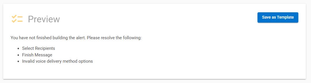The preview card allows the sender to preview the alert to ensure that all the entered information is correct. If there are any required fields that have not been completed, the preview card will notate which required fields are still incomplete (see previous screenshots for examples).