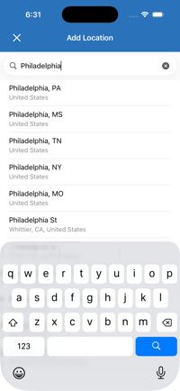 - Search for Location: Search by street, city, zip, etc, and select from a list of results.